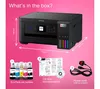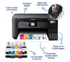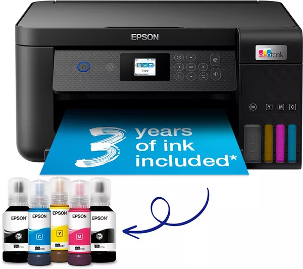 The Epson EcoTank ET-2850 All-in-One Wireless Inkjet Printer eliminates the need for cartridges, offering up to 90% savings on printing costs. With enough ink to print 14,000 monochrome pages or 6,000 color pages, each tank is equivalent to 72 cartridges, reducing refill frequency. This 3-in-1 device handles printing, copying, and scanning, and features a user-friendly 3.7 cm LCD screen. Wireless printing is supported, allowing you to print from your mobile, tablet, or laptop via WiFi, Apple AirPrint, or the Epson iPrint app.
